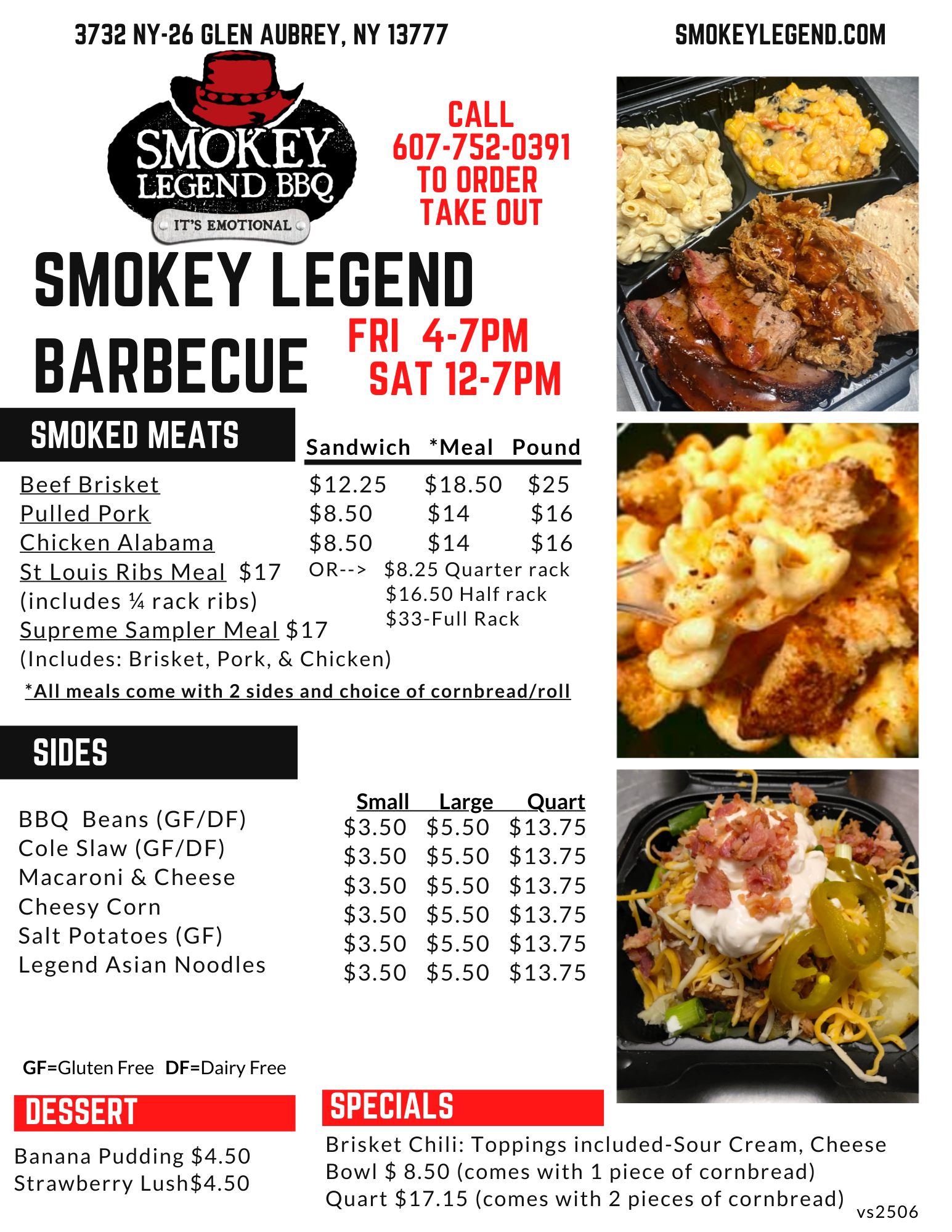 Now serving Take Out every Friday from 4 PM–7 PM and Saturday from 12 PM–7 PM at our Glen Aubrey location right off NY Route 26. Take a look at our upcoming menu below. Call our Take Out number (607) 752-0391 to order!